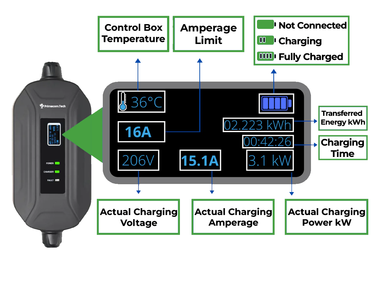 Introducing the Primcom level 2 high-speed EV Charger – up to 16 Amps (3.8kw/hour), providing 15 miles of range per hour. Adjustable amperage with the tap of a button, universal compatibility for all EV and PHEV vehicles, designed for indoor and outdoor usage. 1-year warranty parts and labor warranty. With over 10 different plug options and up to 50 foot cord lengths, level 2 charging is simplified!